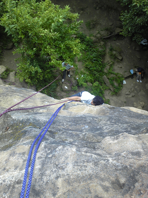 昼頃に少しだけ雨がぱらついてきたが、幸いすぐに止んで、午後は懸垂下降を教わり、確保をつけて2本ほど降りた。