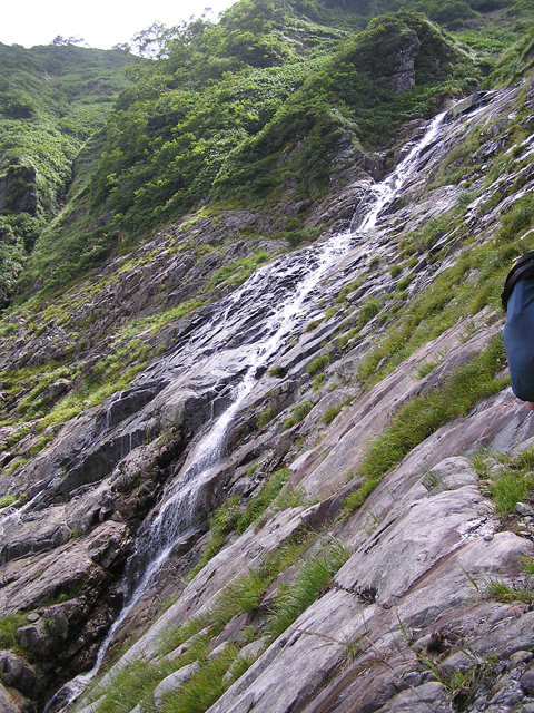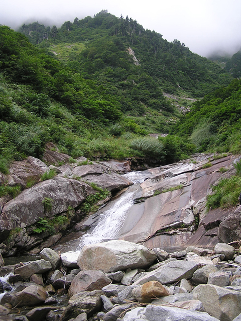 左手のイイ沢をみながら、東ゼンと西ゼンの出合へすすむ。出合で西ゼン方面を見上げるとガスがでてきていた。出合を過ぎるとチムニー滝があられ、第一スラブと続く。その後巨大な第二スラブが現れ、今回初めて沢を経験する人たちは、“こわい、こわい!”と皆声をあげていたが、無事すすむ。