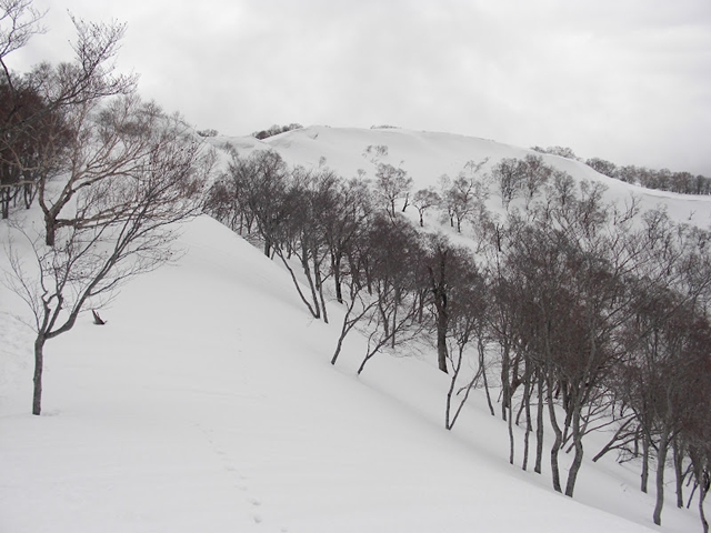 三岩山からはずっとなだらかな稜線歩き。途中変なところから足跡があり、追いかけてみると雪洞だった。スノーシューの人だろう。単独の様だが随分広くてしっかりした雪洞で驚いた。