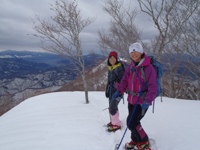 なだらかな尾根を行き、30分弱で鍋クウシ山到着。振り返ると吾妻耶山の独特な形が目を引く。辛うじて陽がでており赤城山など東の山並がよくみえる。