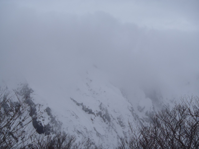 そのうち雪が降ってきた。ヤッケに付いてはすぐに融ける。イヤな雪だなと思っていると間もなく雨に変わった。確かに天気予報では雨だったけど、山は雪だと思っていた。甘かった。